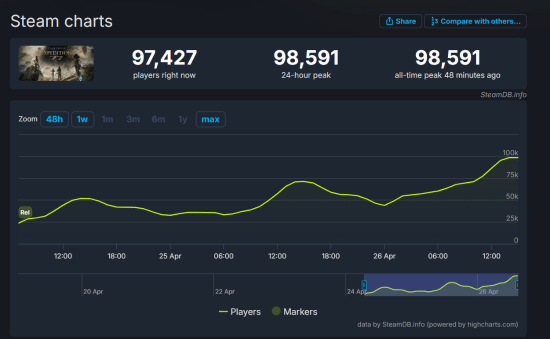 根据SteamDB的数据,《33号远征队》上线首周末,Steam上同时在线人数就突破了98000人!这意味着《33号远征队》已经超越了去年《暗喻幻想:ReFantazio》首周末的。