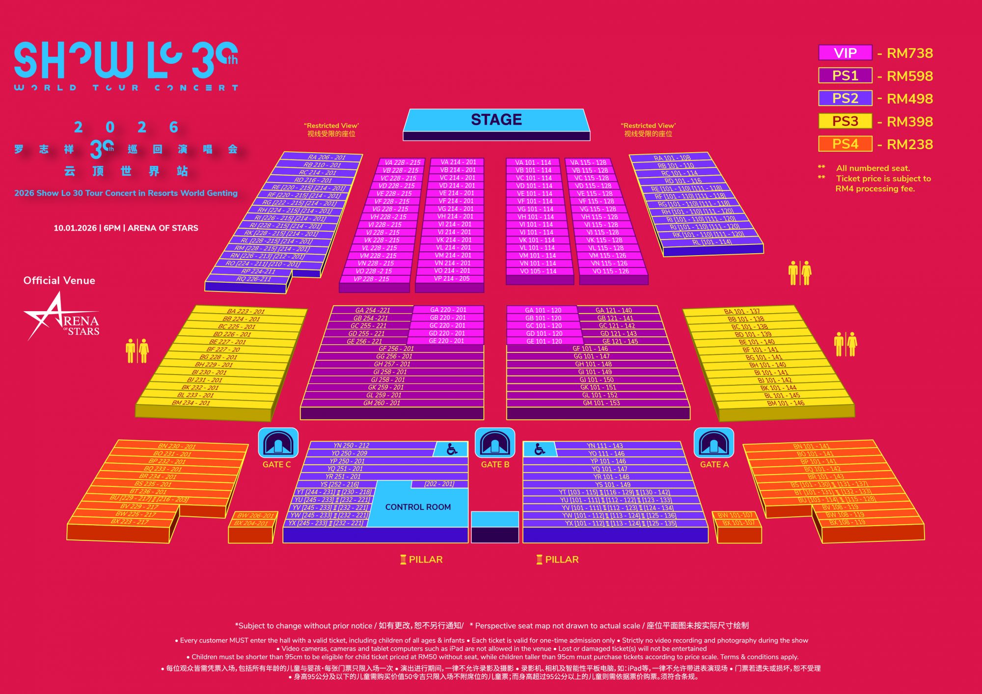 演唱会门票售价为738令吉(VIP)、598令吉(PS1)、498令吉(PS2)、398令吉(PS3)及238令吉( PS4),所有票价未包含4令吉手续费。门票将于 2025年11月19日中午12时起正式公开发售。更多门票及资讯可浏览 rwgenting.com。