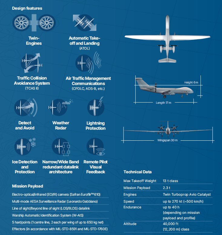 该项目致力于打造一款大型中空长航时无人机,其翼展达30米,最大起飞重量为13吨级,有效载荷能力达2.3吨。“欧洲无人机”配备两台后置的阿维奥航空“催化剂”(Avio Aero Catalyst)涡轮螺旋桨发动机,能够实现最高500公里/小时的真空速。其实用升限为12200米,最大续航时间达40小时。该无人机具备多样化任务能力,涵盖陆地情报搜集、监视、目标捕获与侦察及对地攻击;海洋反潜战(ASW)、反水面战(ASuW)和大范围监视;以及空中预警(AEW)、指挥、控制和通信等。此外,该无人机能够在各类复杂天气与环境条件下运行,包括极端严寒与酷热环境。