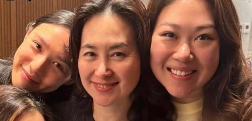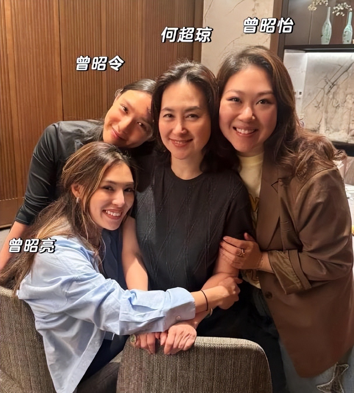 曾昭怡、曾昭令、曾昭亮三姐妹一起和何超琼聚会,家宴之后姐妹和干妈合影,场面好温馨,神似一家人。