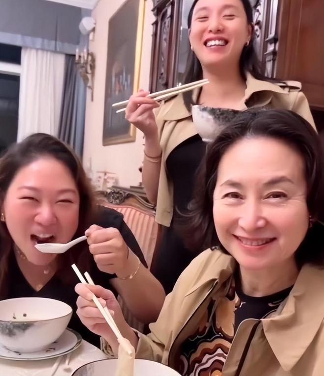 镜头之中的琼姐保养得宜,皮肤紧致漂亮,完全可以看成是40岁的女人,琼姐和三个干女儿聚会,状态超好。