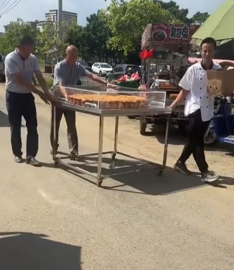这块月饼到底有多大呢?从游客拍到的照片可见,这个巨型月饼的直径约有一米那么大,需要三个成年男子合力用推车将月饼送上门!
