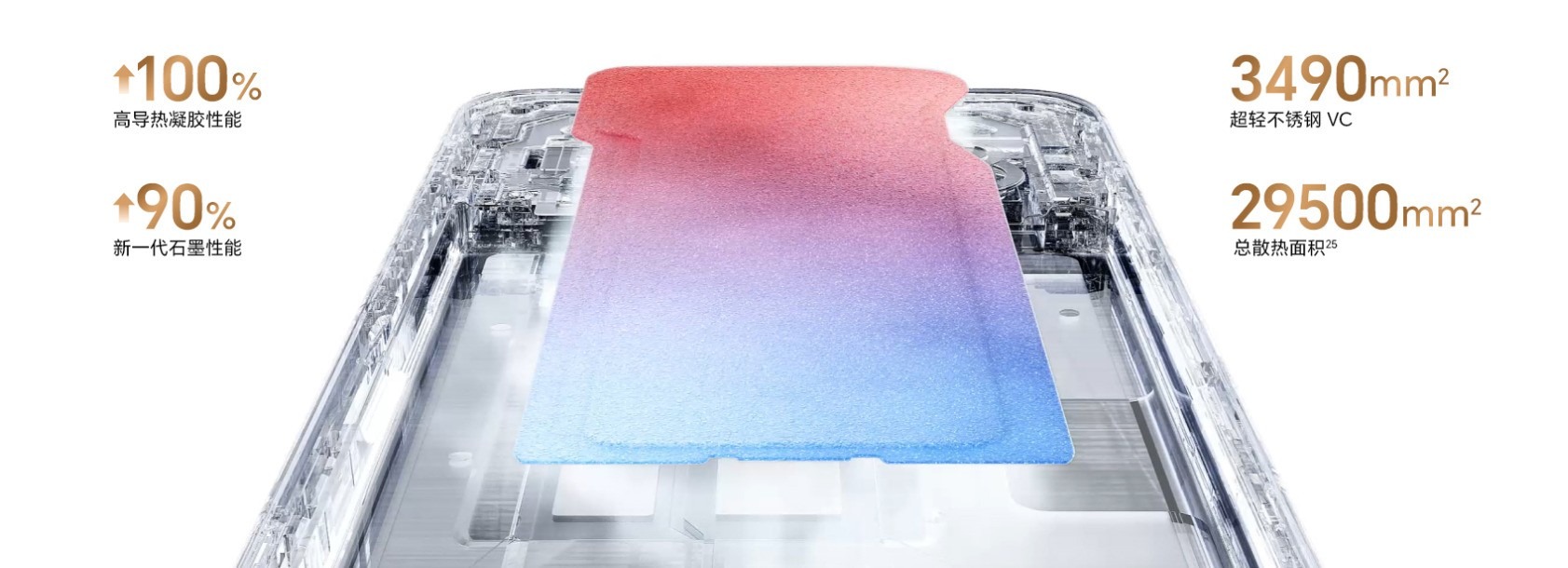 在散热方面,荣耀X70的配置也相当强大,其搭载了荣耀冰封 VC 散热系统,全新第五代超导六方晶超大面积石墨与超轻不锈钢 VC 强强联手,冷热联通,更快均热。