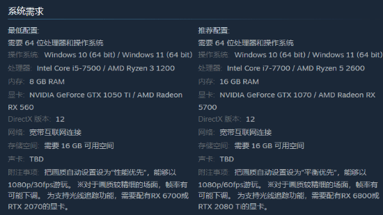 使用最低配置时,把画质自动设置设为“性能优先”,能够以1080p/30fps游玩。 对于画质较精细的场面,帧率有可能下调。 为支持光线追踪功能,需要配有RX 6700或RTX 2070的显卡。使用推荐配置时,把画质自动设置设为“平衡优先”,能够以1080p/60fps游玩。 对于画质较精细的场面,帧率同样有可能下调。 为支持光线追踪功能,需要配有RX 6800或RTX 2080 Ti的显卡。