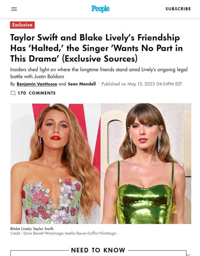 搜狐娱乐讯 据外媒,泰勒·斯威夫特(Taylor Swift)和“S女王”布蕾克·莱弗利(Blake Lively)的友谊终止了,霉霉不想被牵扯进布蕾克和贾斯汀·贝尔杜尼(Justin Baldoni)的抓马事件。