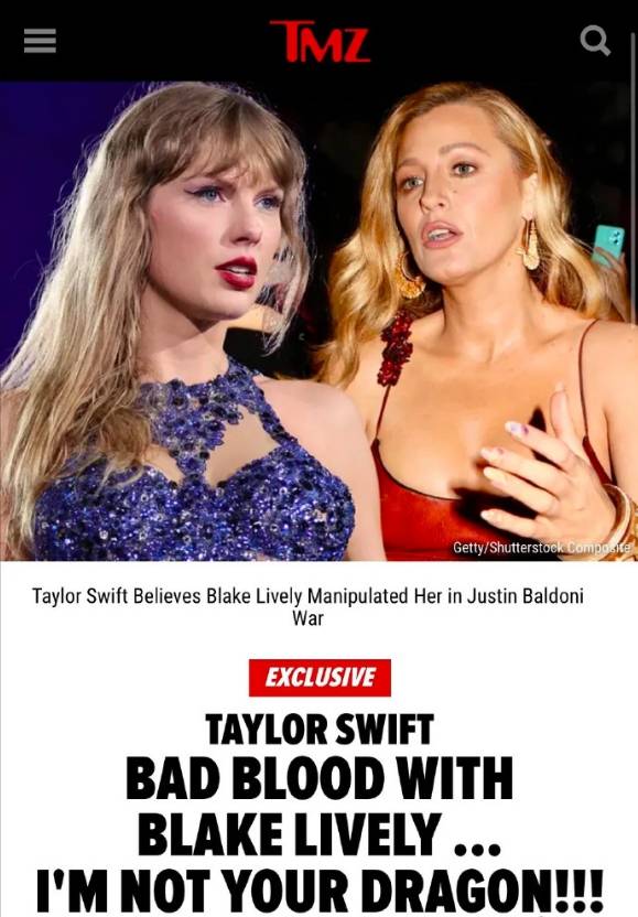 外媒曝光了布莱克给贾斯汀发的短信,在短信中她称自己为卡丽熙(龙妈),而暗指好友“霉霉”Taylor Swift和丈夫Ryan Reynolds为自己的龙。据TMZ,霉霉不满自己被牵扯进纷争并被利用,不满布莱克称自己为龙。