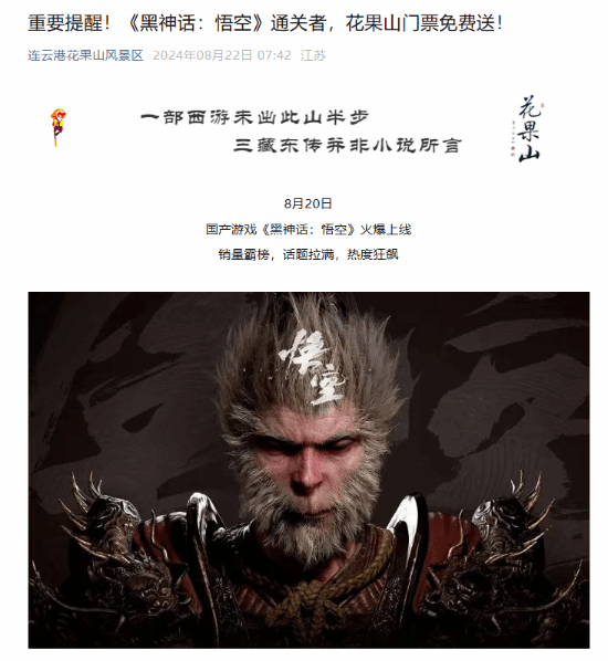 大圣老家官宣:《黑神话:悟空》通关者可免费获花果山门票!