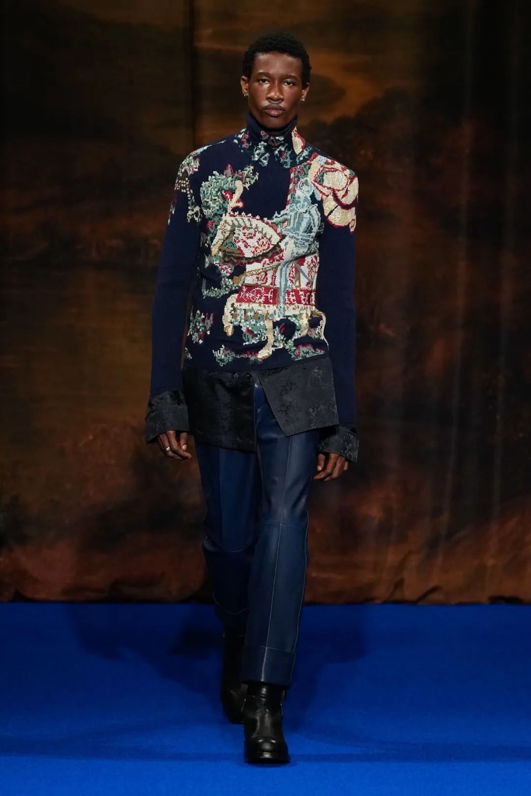 类似这样的细节整场秀上还能找到很多:针织连衣裙上大面积的纱线流苏、挂毯质地的上衣上描绘的乡村田园景象……