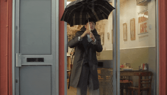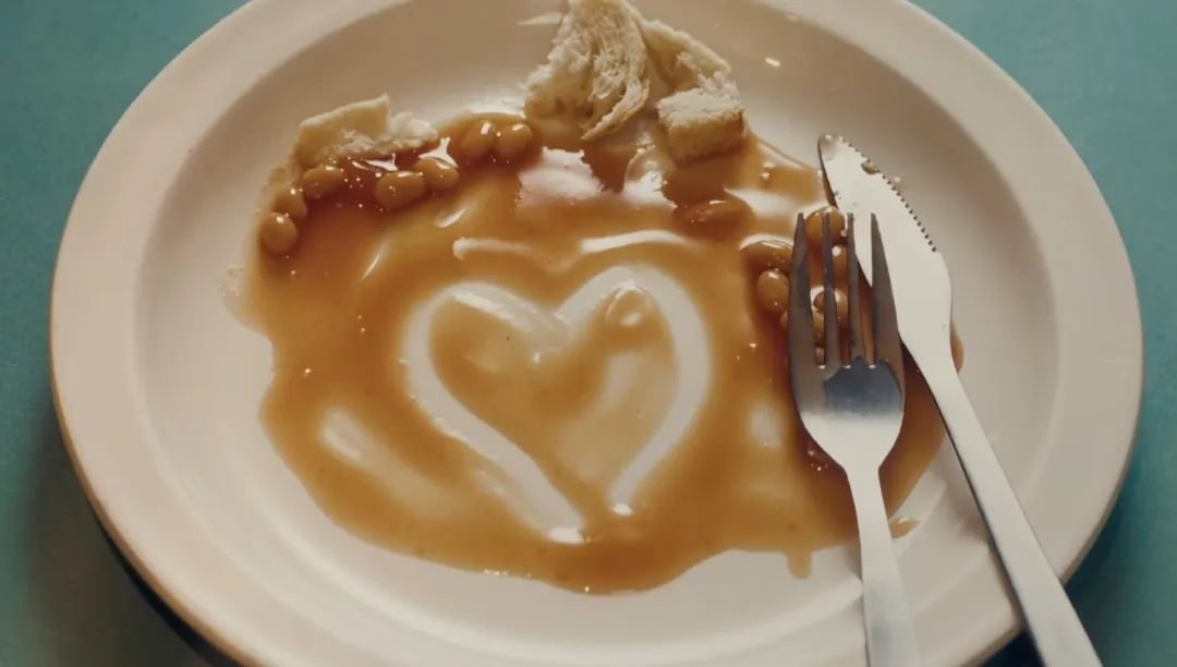 当他撑着格纹伞走出咖啡店的时候,镜头一转,原来他用茄汁在盘子上画了一个可爱的爱心。
