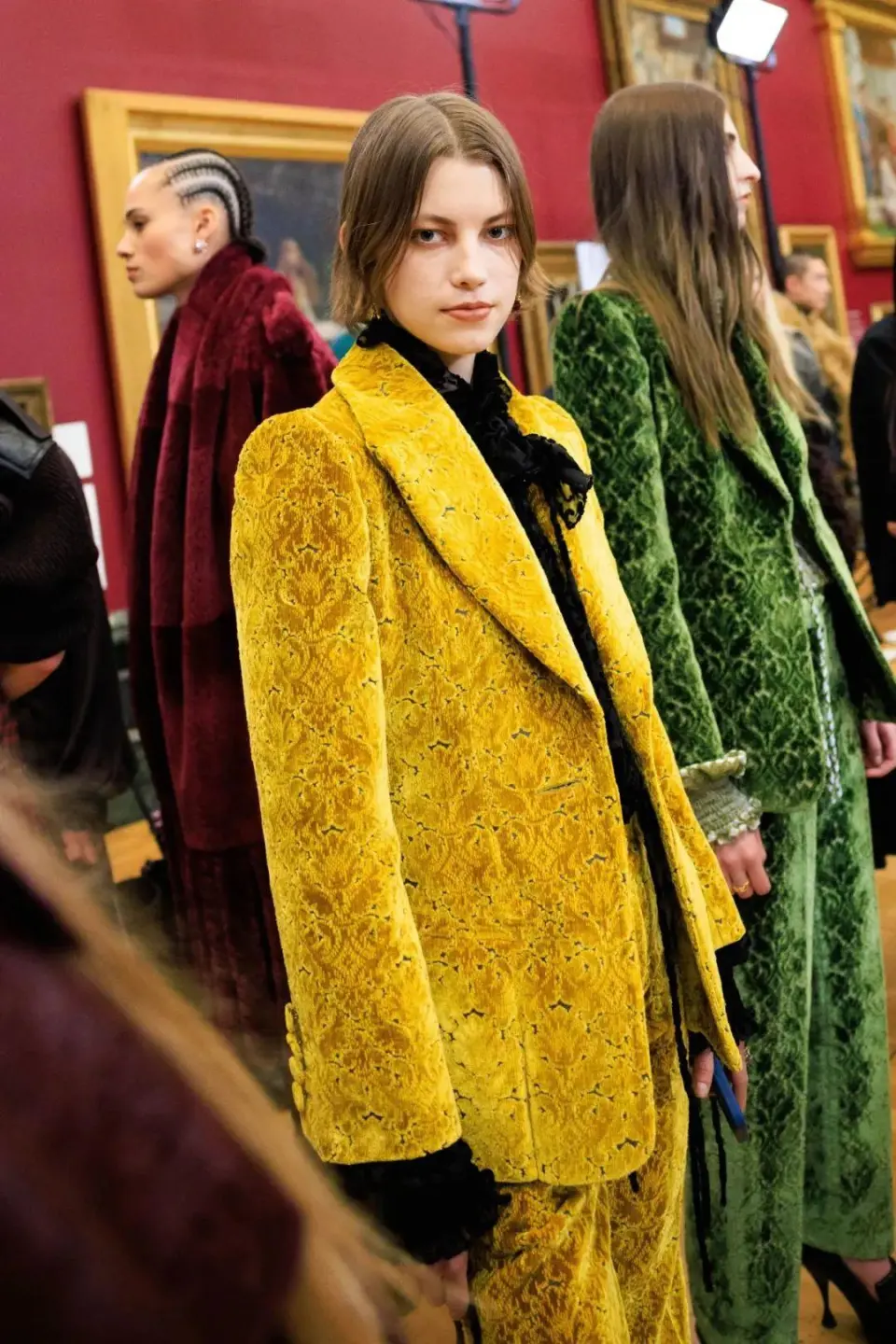 落叶黄、铁锈棕、暗苔绿……用色像极了古旧油画的笔触,配上丝绒材质和繁复提花图案更是有种微妙的慵懒与阴郁。