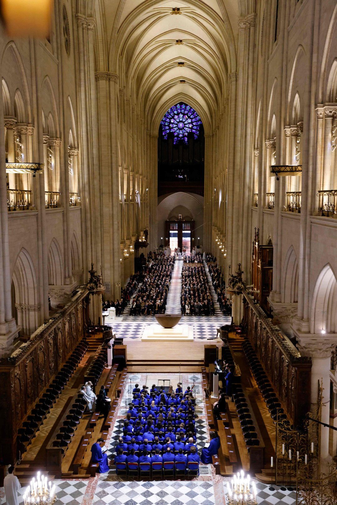 由于当天天气不佳,全部仪式都在圣母院内部举行。法国总统马克龙夫妇、美国当选总统特朗普、代表美国现任总统拜登出席仪式的拜登夫人吉尔、乌克兰总统泽连斯基、英国威廉王子、陪同特朗普出席仪式的马斯克以及法国前总统萨科齐、奥朗德等均在座。大约两千到三千人在圣母院内出席仪式。