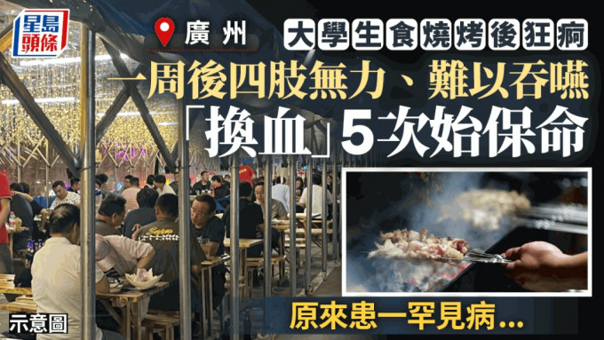 广州有大学生因BBQ疑进食不洁食物,致患罕见免疫系统病,要「换血」5次才保命。
