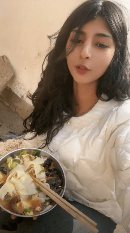 小黑妮手捧手擀面蹲在家门口吃饭影片,获5000多万浏览。