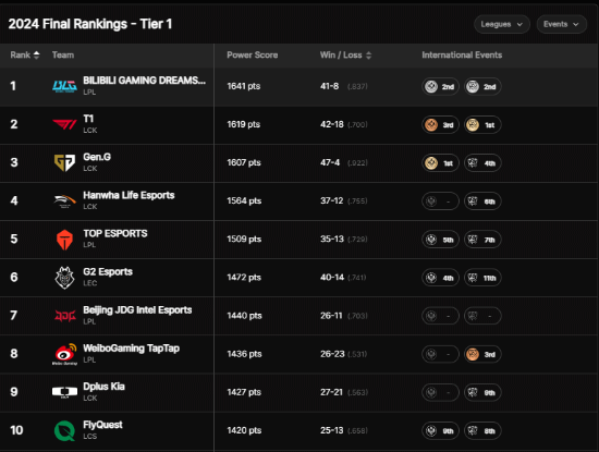 英雄联盟2024全球总决赛落下帷幕后,拳头游戏官网更新了“2024年全球战力最终排名榜单”。S14亚军BLG以1641总积分登顶第一,而成功卫冕的T1的最终积分为1619分,从第六名升至第二。