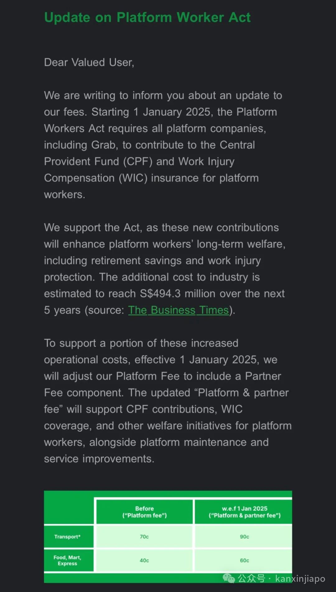 此次涨价因《平台员工法案》的实施,法案规定,从明年起为1995年及以后出生的司机强制缴纳公积金(CPF),初期缴纳比例为3.5%,到2029年达到一般雇主标准,并提供与普通员工相同水平的工伤赔偿保险。