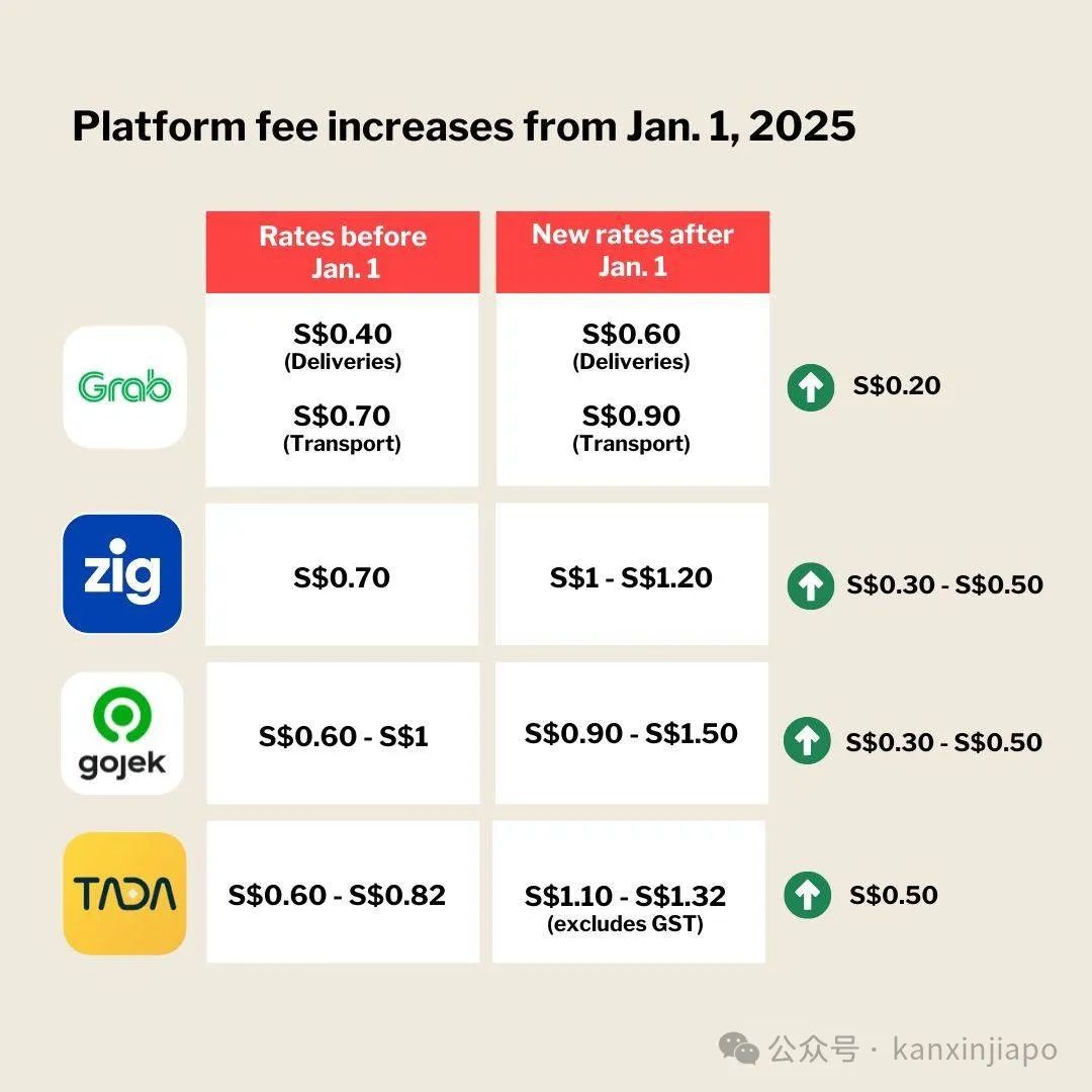 Tada的涨幅为0.5新元,平台费用范围调整至1.05新元至1.25新元,司机费用0.5到0.8新元的政策延长至2025年6月30日。