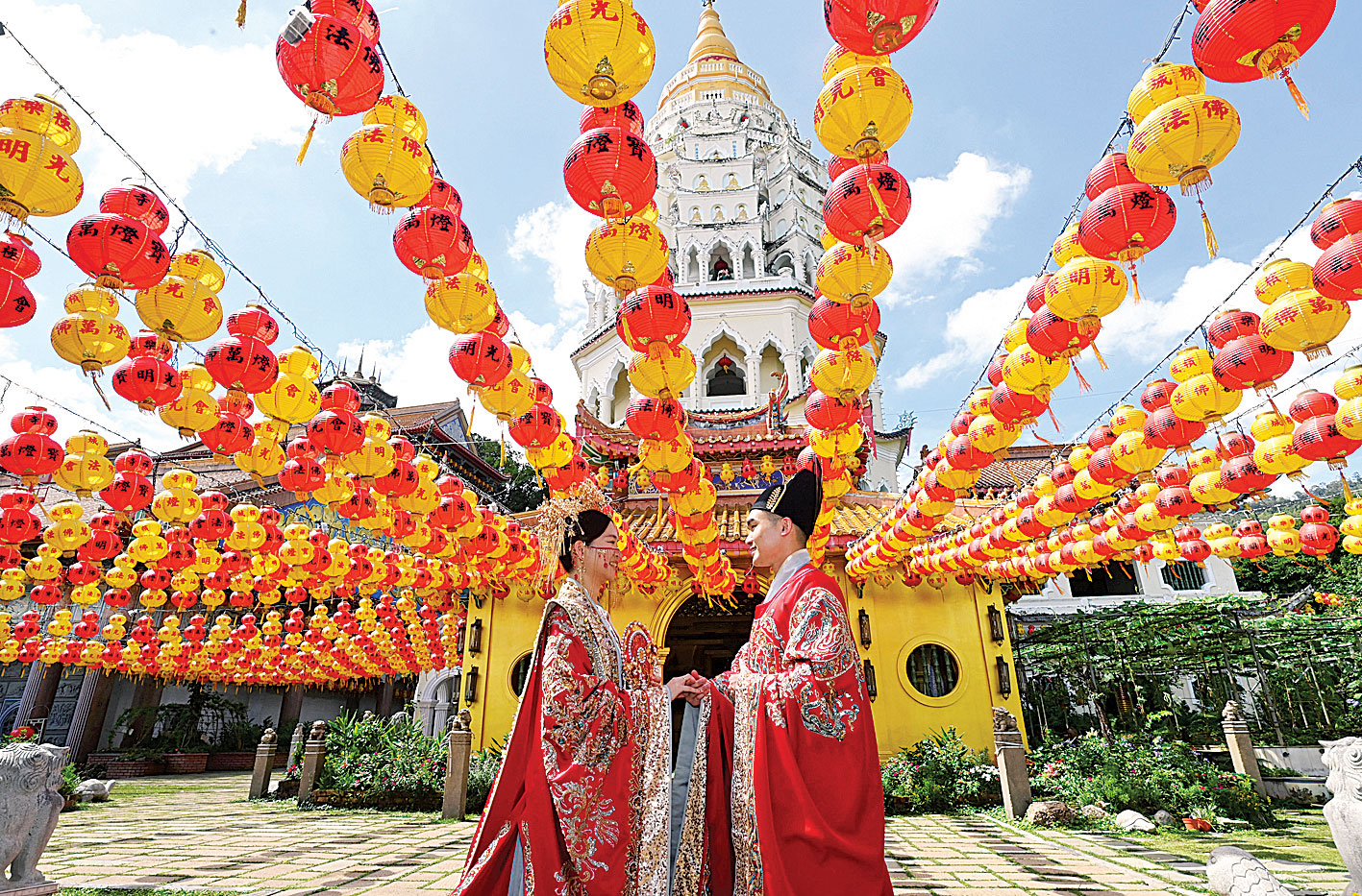 一对新人在万盏灯笼的极乐寺拍摄婚纱照。