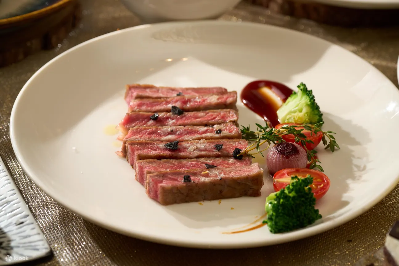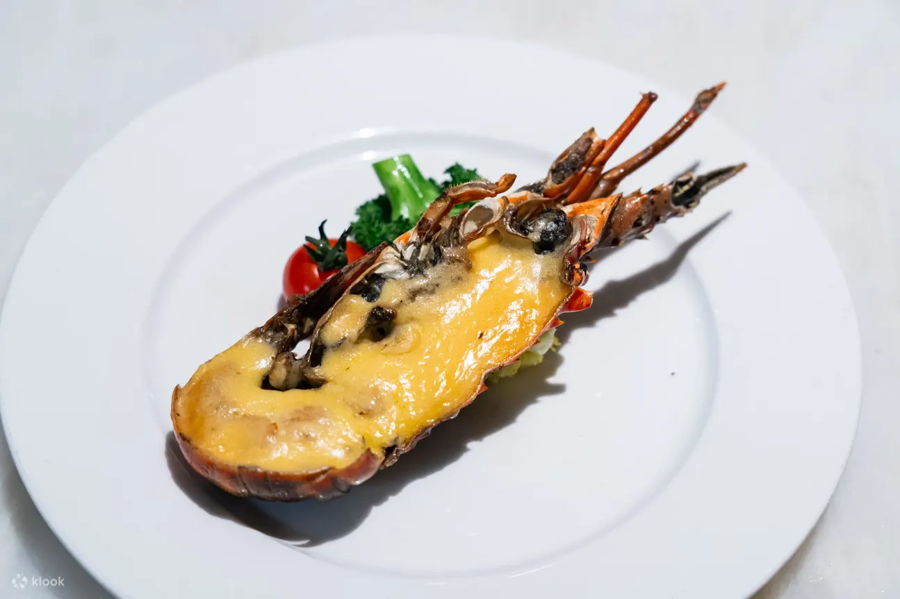 沿桌送餐服务:法式焗蜗牛、蒜香芝士焗龙虾、香煎鹅肝、香煎银鳕鱼配青柠奶油汁、火焰雪糕蛋糕