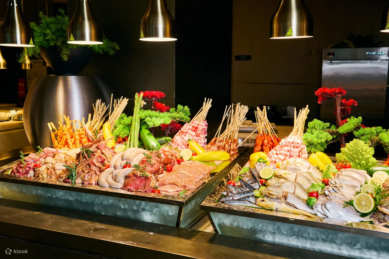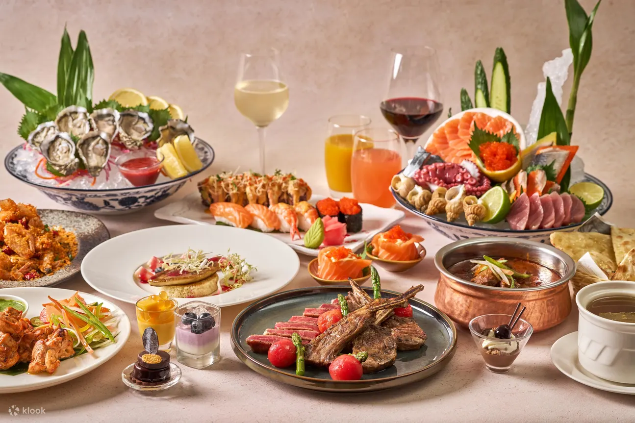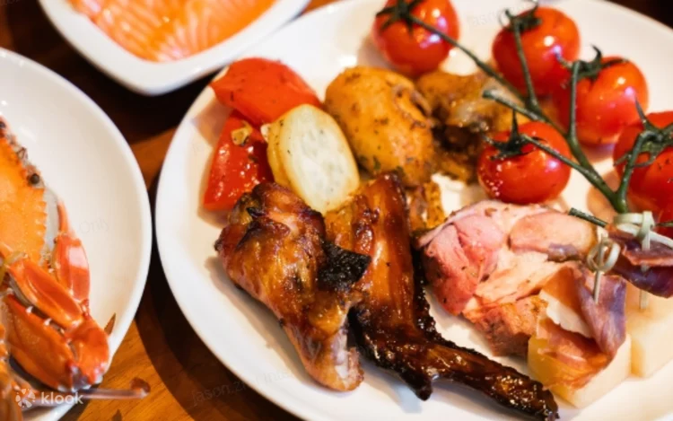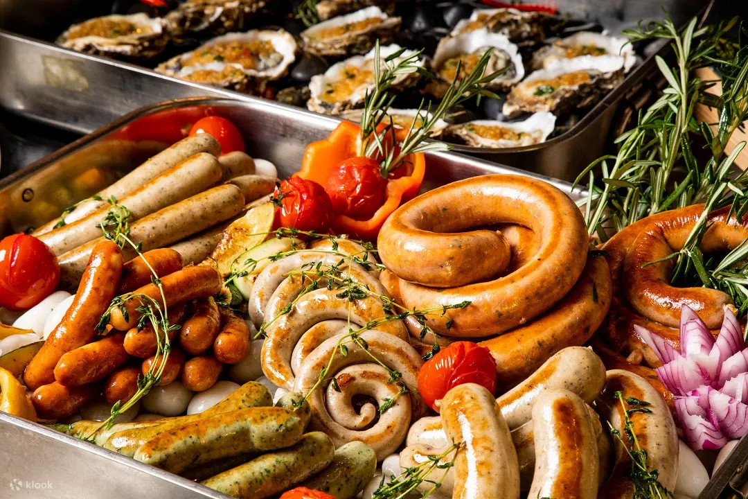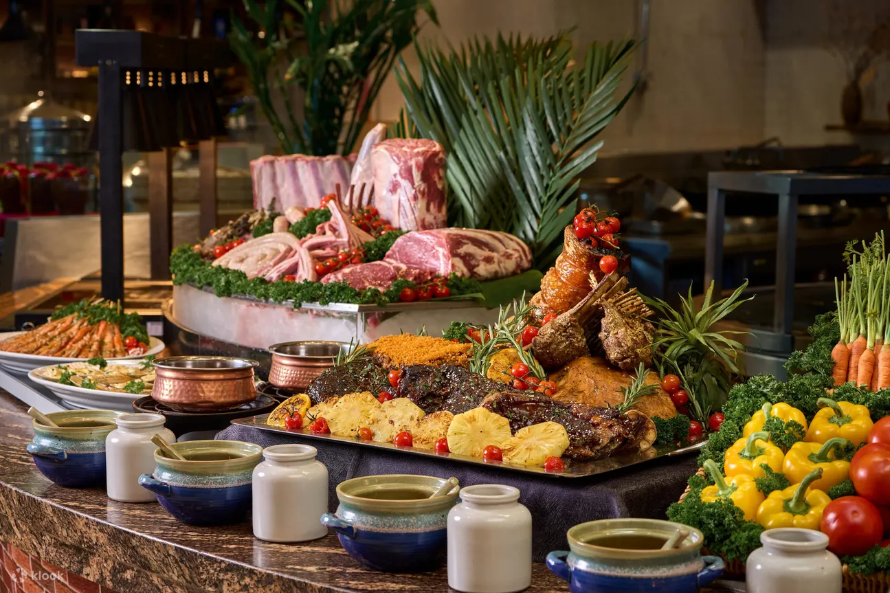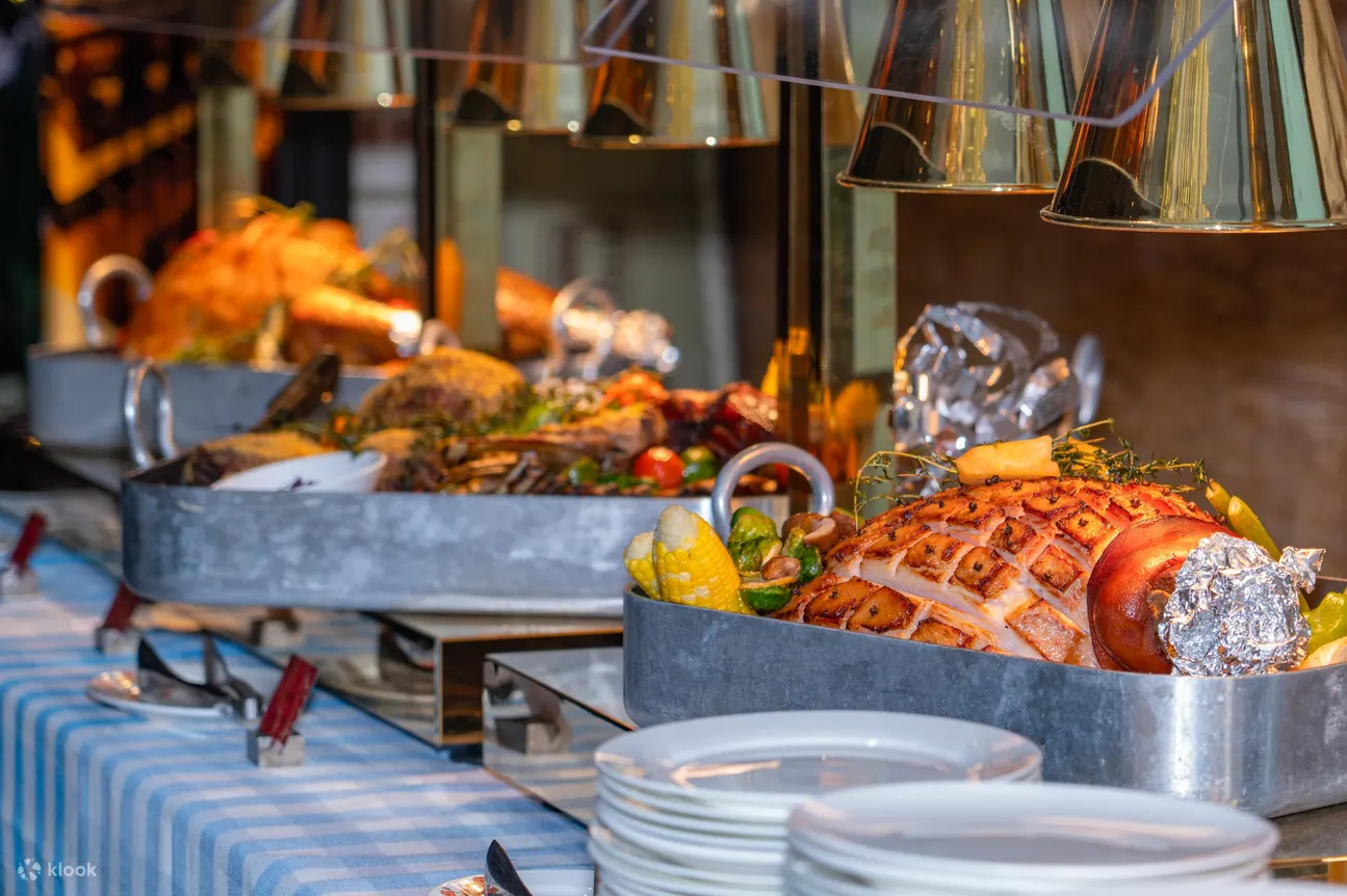 精选佳餚:蒸生蚝、烤整羊、烤火鸡和圣诞火腿、阿拉斯加蟹脚 、法国生蚝、西班牙火腿配蜜瓜 、黄鳍金枪鱼、腌制黑松露三文鱼、圣诞主题甜点