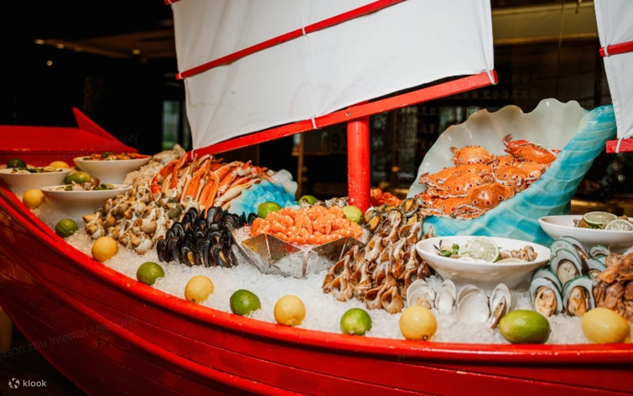 餐单:位上鲜活龙虾(每人一只),帝王蟹腿,鳕蟹腿,十三种鲜活海鲜,三文鱼,甜虾,北极贝,金枪鱼,圣诞烟燻火腿,香烤火鸡,内蒙烤全羊,黑松露粉丝蒸生蚝,鲜椰子,鲍汁扣辽参等美食