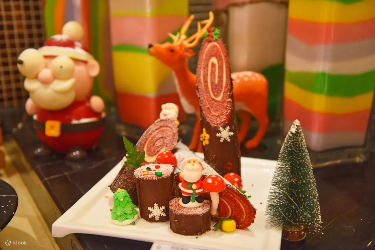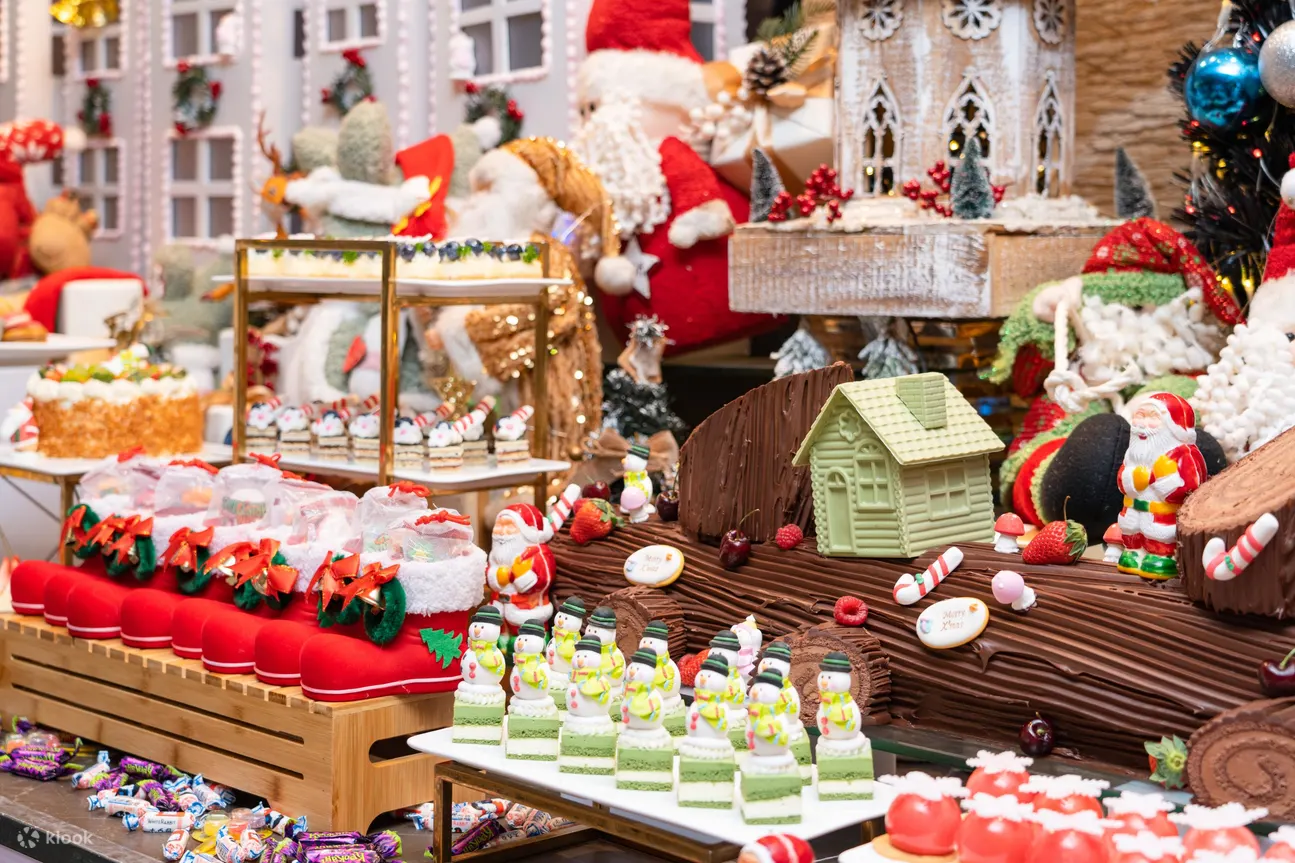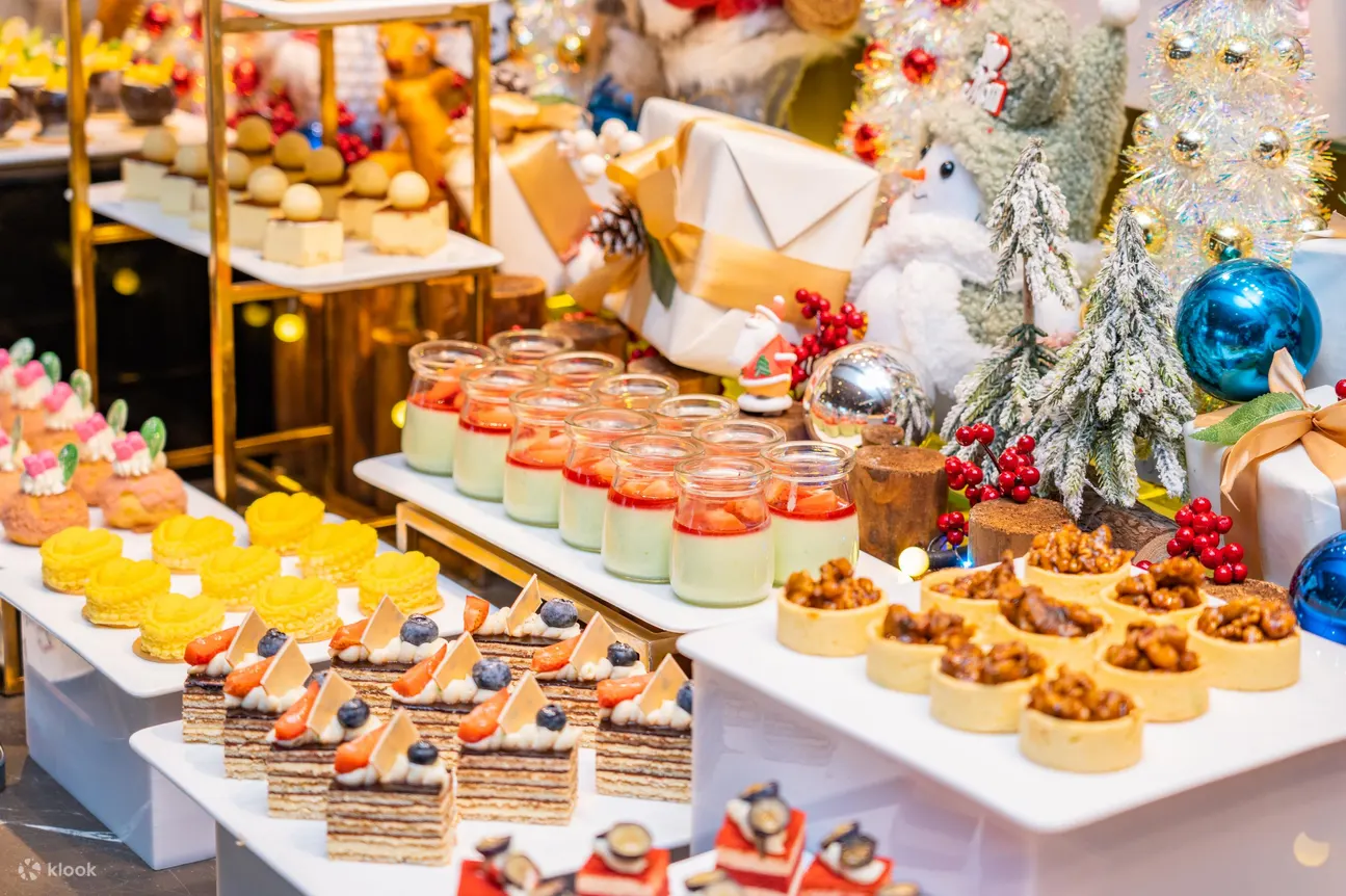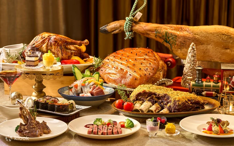 精选佳餚:烤火鸡和圣诞火腿、阿拉斯加蟹脚 、法国生蚝、西班牙火腿配蜜瓜 、黄鳍金枪鱼、黑松露腌制三文鱼、鲍鱼炖汤、圣诞主题甜点