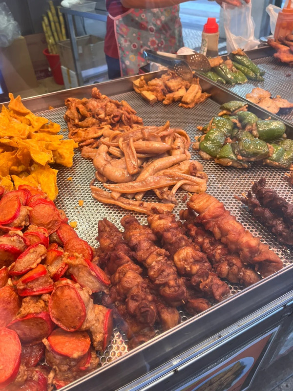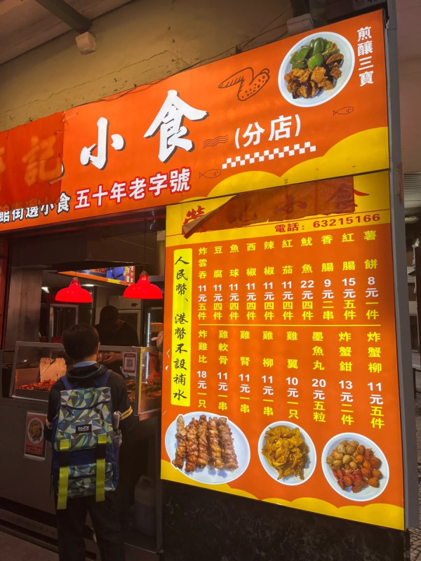 荣记小食同样是沙梨头海边街「宵夜三巨头」之一,以各式炸物闻名,尤其是其「煎酿三宝」。这些炸物由老闆现场制作,鱼浆香脆可口,炸至金黄透亮,内里依然多汁。除了煎酿三宝,还有炸云吞、炸红肠、鱿鱼、蟹钳、鸡髀、鸡翼和鸡肾等,选择丰富。建议搭配甜酸辣酱或喼汁享用,是深夜解馋、重温童年回忆的绝佳选择。
