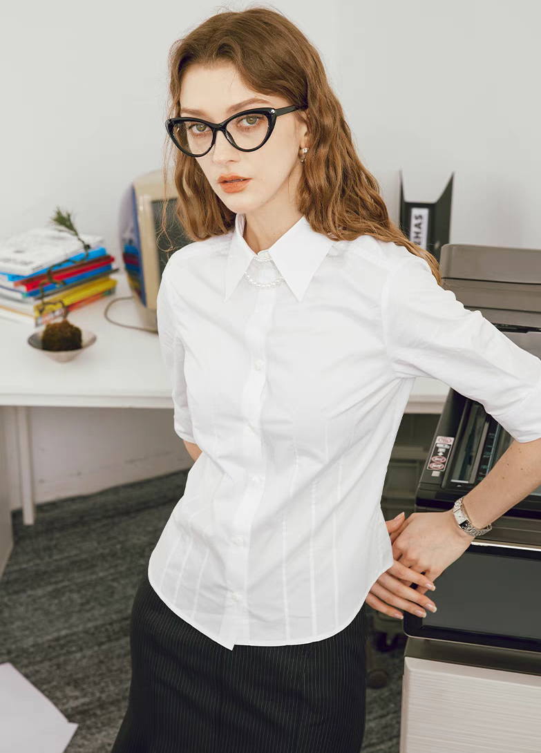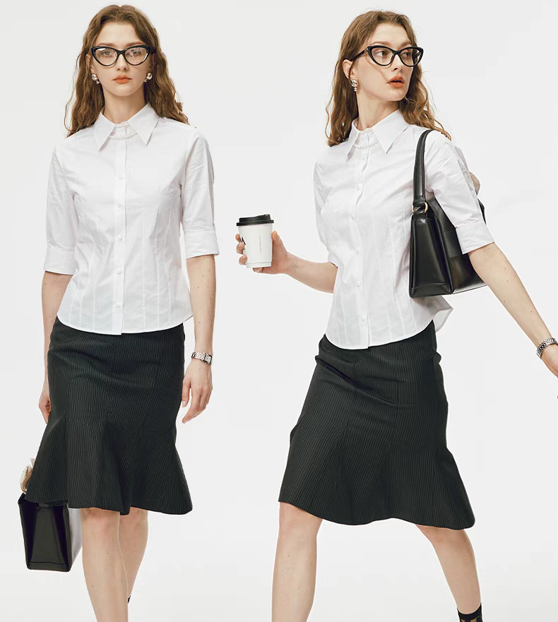 这一套摆脱刻板职业装的沉闷,白衬衫 + 鱼尾裙既保留专业感,又用裙摆设计增添女性魅力,适配商务洽谈、日常办公等场景,穿着者行动时,鱼尾摆动还能展现 “利落中带优雅” 的气场。