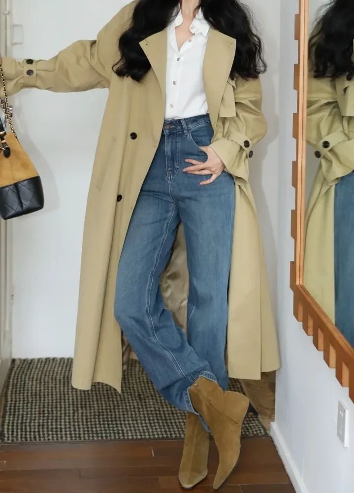 卡其色风衣、白衬衫、牛仔蓝、驼色短靴,用最基础的颜色搭一起,和谐得很,轻轻松松就穿出高级感,简约又好看,完全是 “不费力赢很大” 的穿搭模板 。