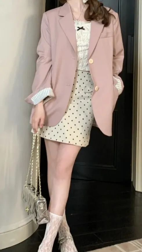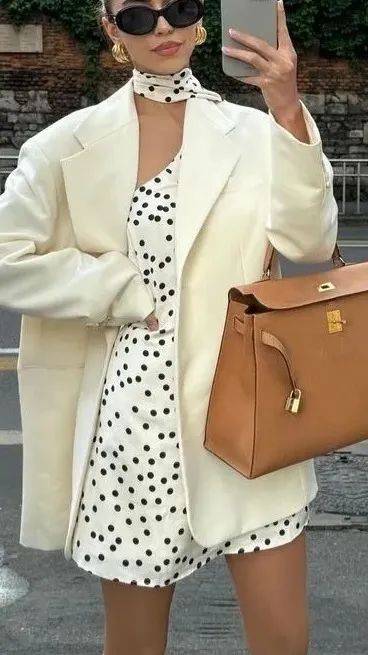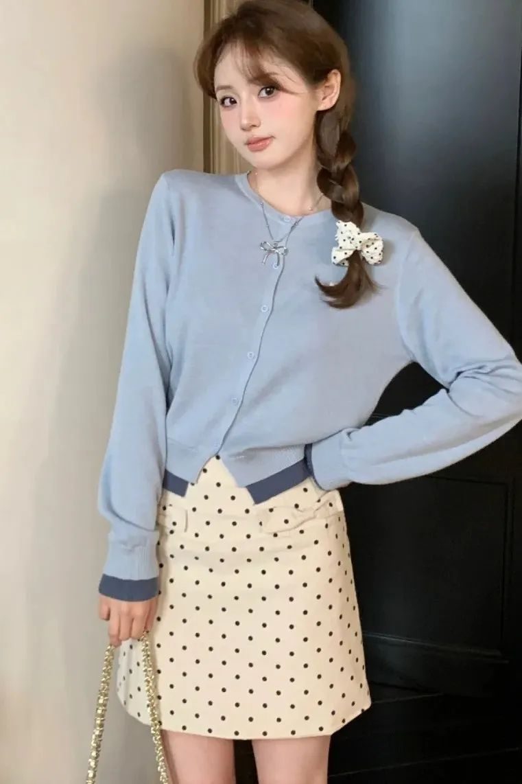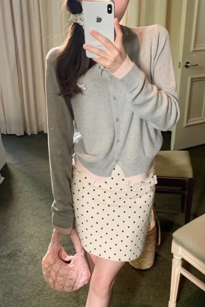 针织开衫 + 波点半裙组合,开衫柔软显亲和力,半裙带波点元素增添俏皮,比正装裙更松弛,又比纯休闲裙有秩序感。