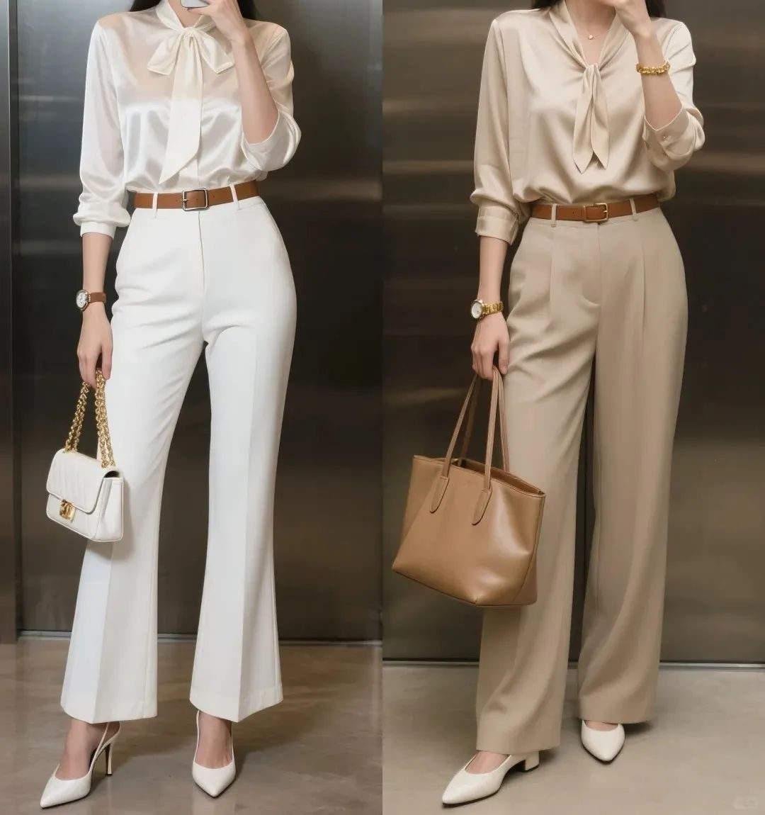 第一套:飘带领真丝衬衫 + 直筒西裤
