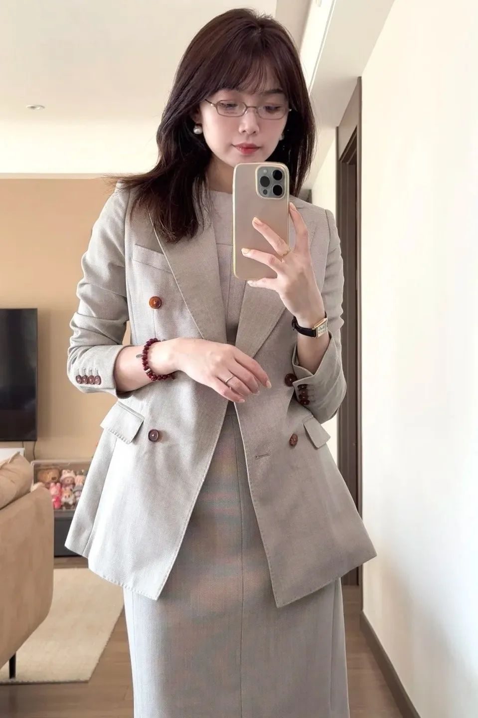 墨镜、手链等配饰添上,瞬间切换 “职场人下班后逛艺术展” 的松弛模式,一套穿搭打通工作与生活场景,时髦精属性拉满!