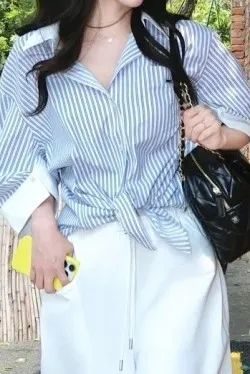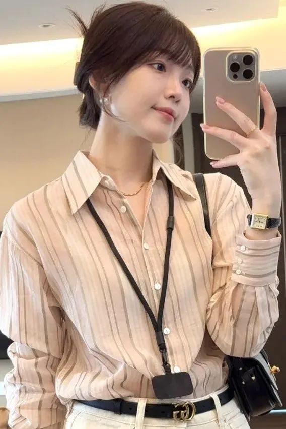 条纹元素的衬衣是打造活力轻熟风的不二之选。经典的蓝白条纹自带清新感,给人一种简洁明快的感觉 。