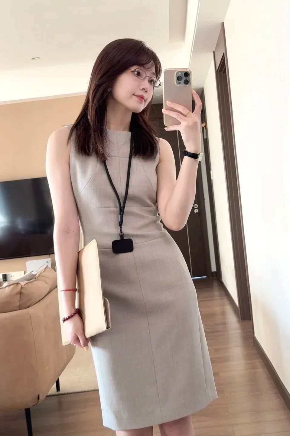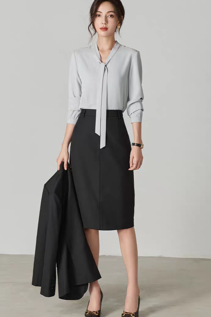 直筒包臀裙长度到膝盖中上部,露出小腿最纤细部分,走路带风但不夸张,适配商务洽谈、重要会议等 “需要镇场” 的场景。