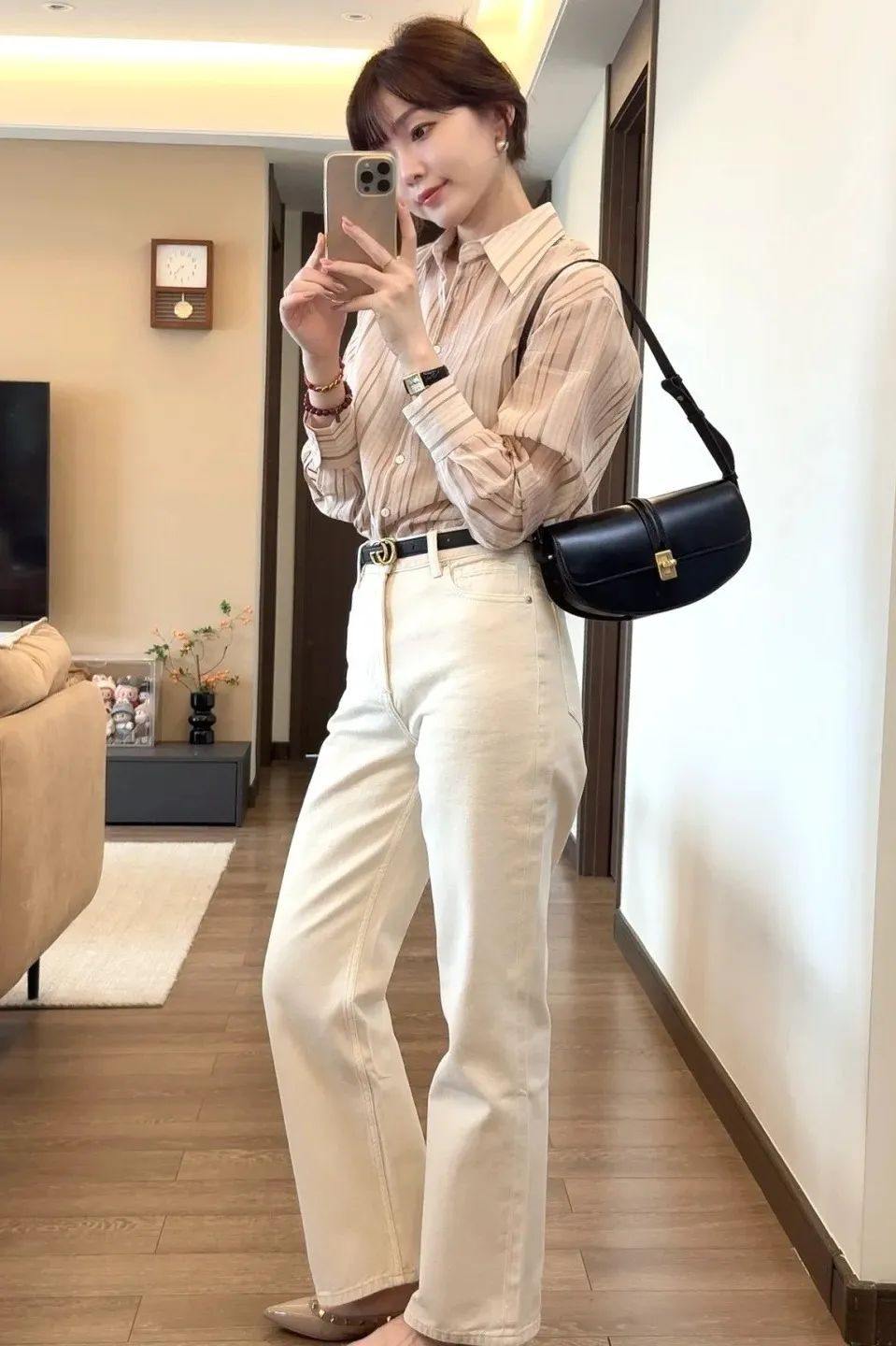浅色系条纹衬衫简约又有质感,搭配休闲的米白牛仔裤,加上精致小配饰,既保留轻熟的优雅,又有周末放松的随性,活力感也在线,很适合轻松周末氛围 。