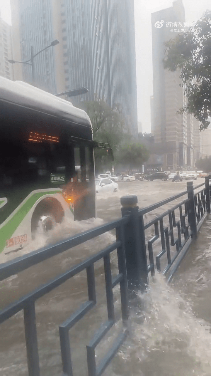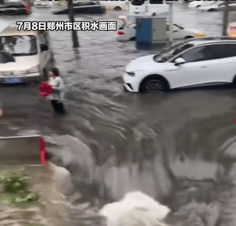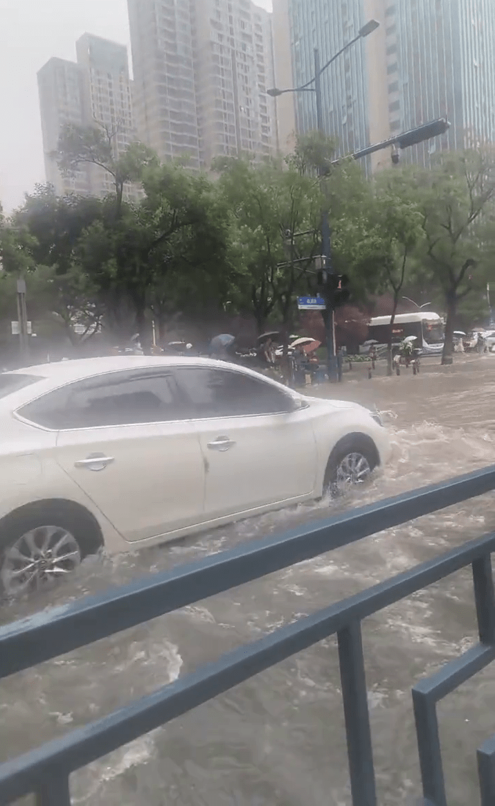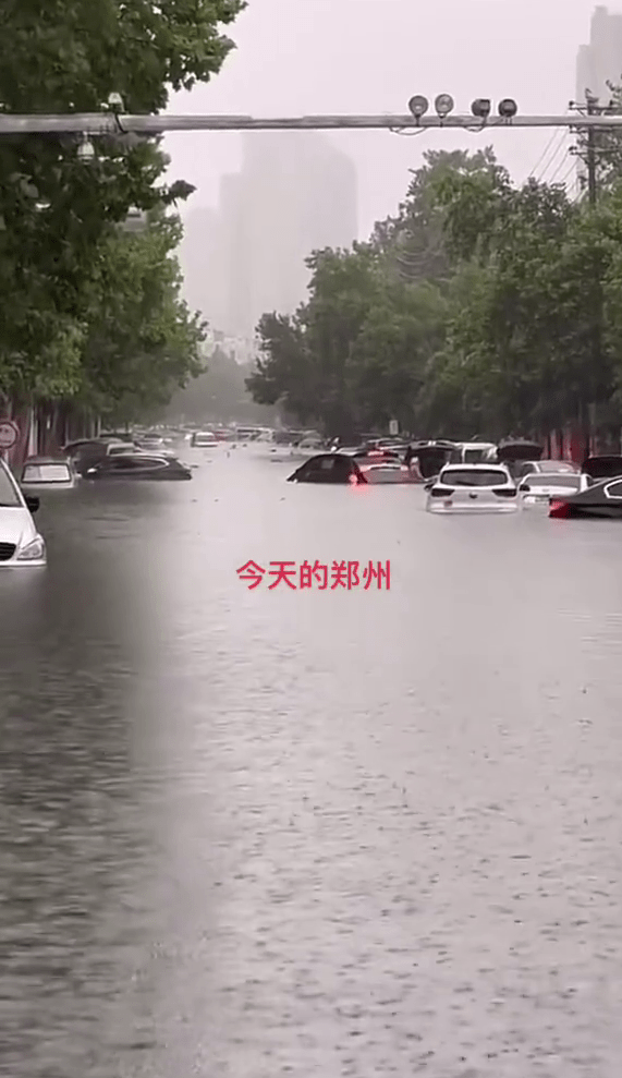 郑州暴雨致马路积水,水位至挡风玻璃多车被淹。