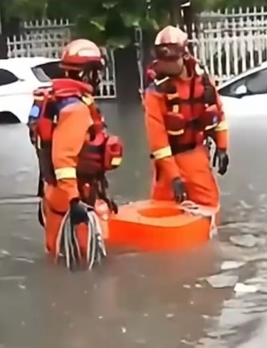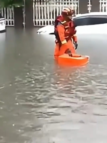 暴雨下的郑州,水浸严重,马路出现小瀑布。