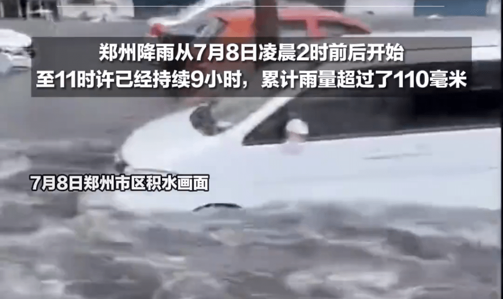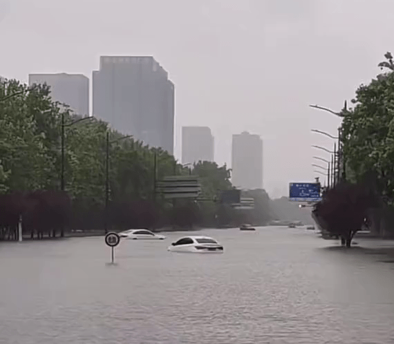 郑州暴雨,马路积水至挡风玻璃,多车被淹。