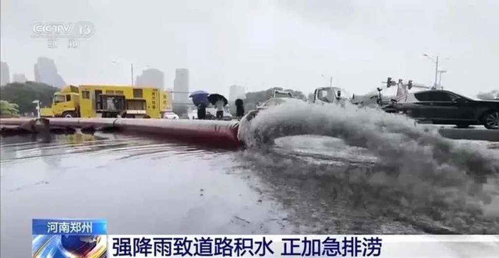 郑州道路积水,出动大型抽水设备排涝。 央视截图