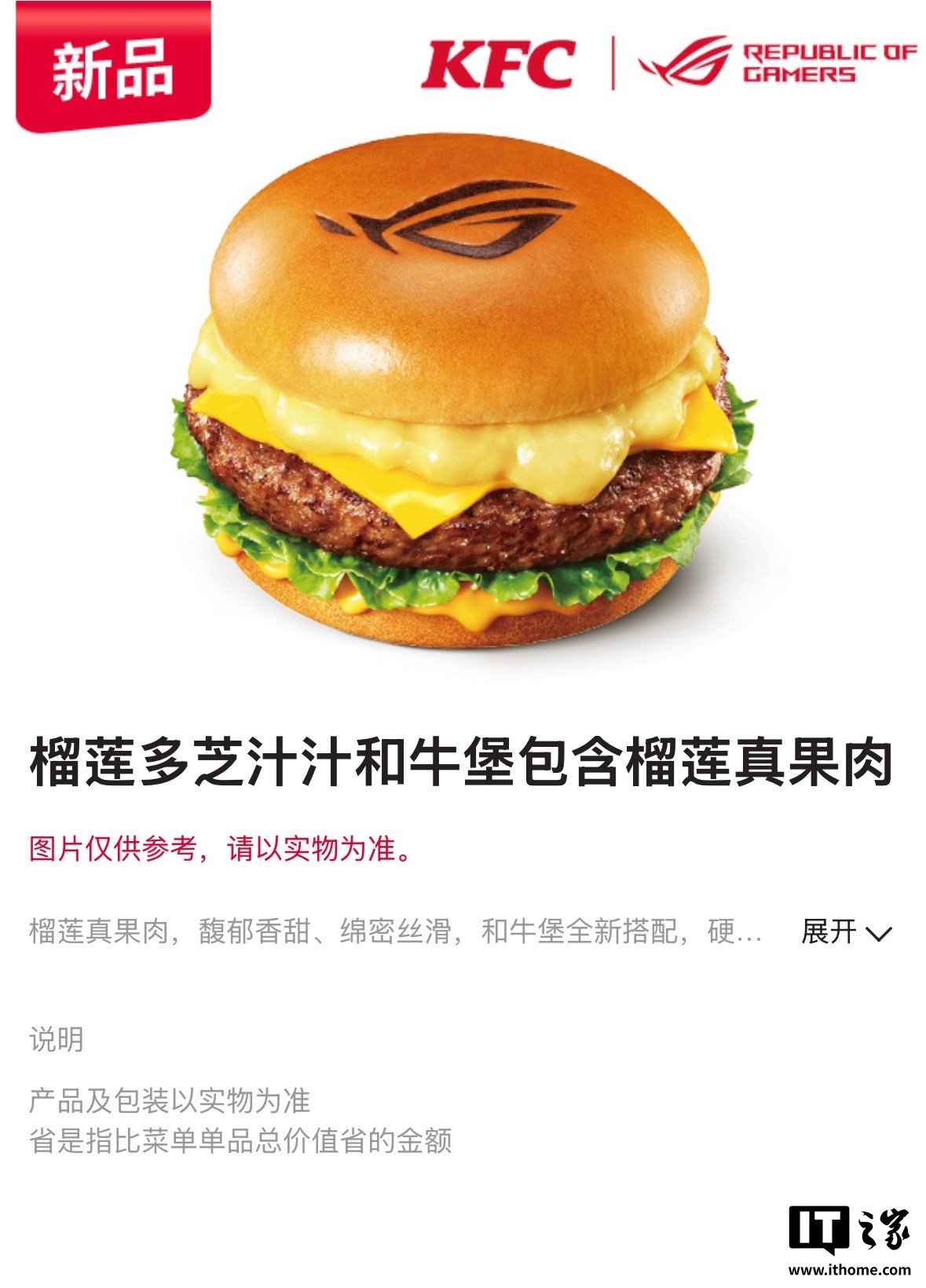 据悉,ROG 和肯德基推出两种联名汉堡,顶部均采用“败家之眼”LOGO 的 ROG 玩家国度定制面包,其中“榴莲多芝汁汁和牛堡”内部则夹有 120g 国产和牛肉饼与榴莲果肉酱以及芝士、青菜、其它酱料。消费者也可选同样采用 ROG 定制面包的芝士烟熏风味芝芝和牛堡。