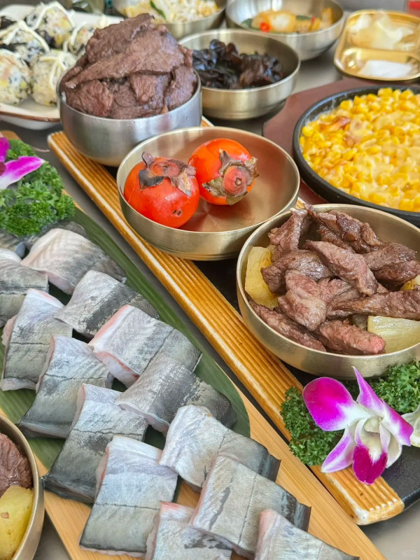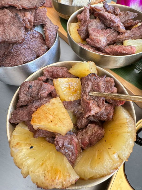 韩牛大叔 · 活鳗鱼炭火烧肉的招牌是现杀活鳗鱼,鳗鱼现点现劏、还会在盘子里微微扭动,非常新鲜。专人全程代烤,把鳗鱼烤到外皮微焦、里面依旧柔嫩弹牙,用海苔包着蘸一点玫瑰盐,一口下去满满的鲜甜和炭香,非常惊艷。如果你本来就爱鳗鱼饭,一定要试试这种炭火现烤版本,更香更有层次。肉类方面,济州岛厚切五花肉肥瘦相间、火候刚好,炭火香气裹着肉汁,完全不腻口。喜欢重口味的还可以点奶香芝士牛肋条,烤好的牛肋条再缠上拉丝芝士,层次感很丰富~