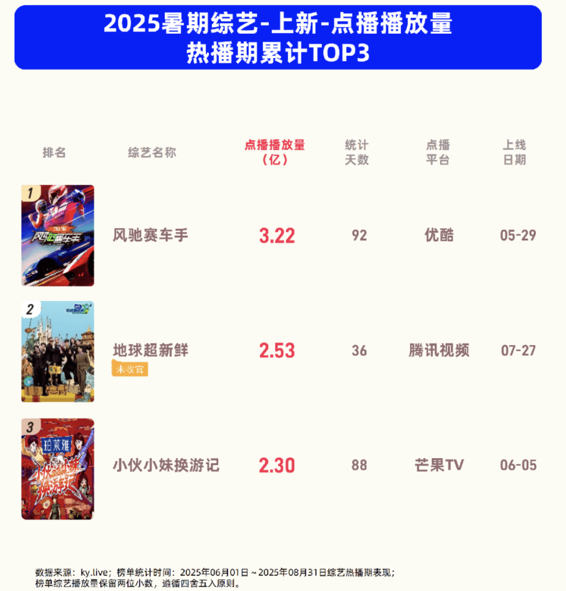 值得注意的是,新综艺虽未撼动老牌IP的头部地位,却在垂直赛道展现出强劲的创新势能。2025暑期“上新”综艺点播播放量TOP3中,《风驰赛车手》《地球超新鲜》《小伙小妹换游记》分别以3.22亿、2.53亿、2.30亿播放量脱颖而出,这些新节目避开了传统综艺的同质化竞争,聚焦“赛车竞技”“自然探索”“跨地域体验”等细分题材,以差异化内容吸引特定受众。