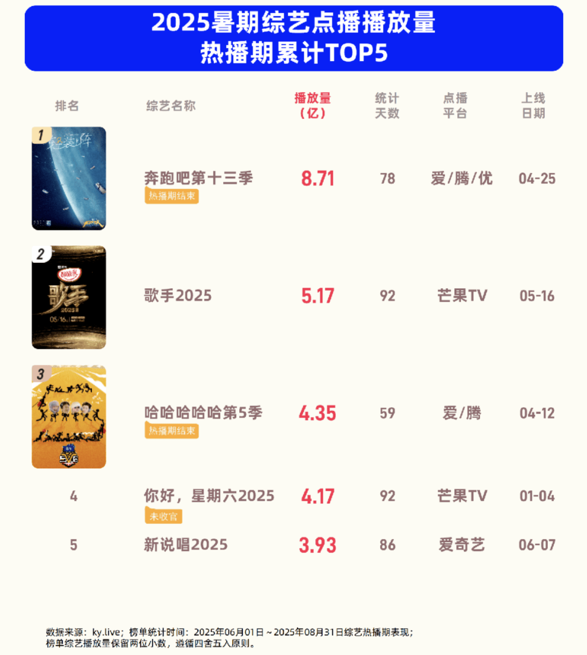 而在点播播放量TOP5榜单中,《奔跑吧第十三季》再次以8.71亿播放量领跑,《歌手2025》则以5.17亿播放量位列第二,两大IP在全端与点播赛道的双重亮眼表现,印证了经过多年沉淀的综艺IP已形成稳定的观众基础——《奔跑吧》系列凭借户外竞技的趣味性与嘉宾互动的亲和力,持续收割全年龄段观众;《歌手2025》则依托专业的音乐竞技属性,牢牢抓住音乐爱好者群体,成为暑期档“流量担当”。