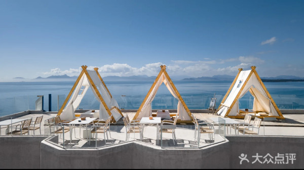 再往上走,是主打饮品与休闲的咖啡层,气氛较轻松,很多人会在这里点杯咖啡,坐在靠窗位置吹海风、影相、聊天。最顶层是天台帐篷区,沒有遮挡,整个大鹏湾海景盡收眼底,白天可以晒太阳、晚上则点起小灯串,变成气氛感十足的露天空间。