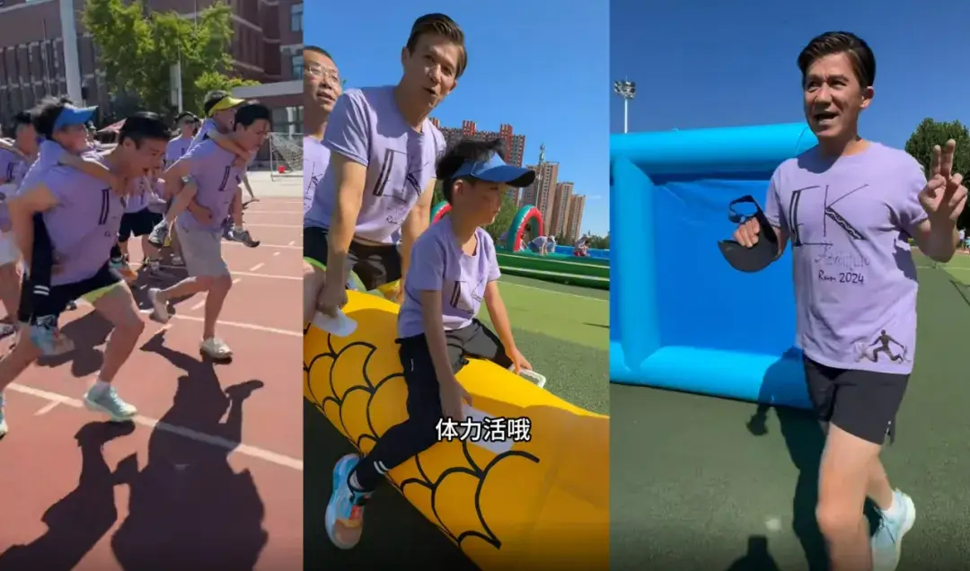 到学校后,已经是爷爷辈的李子雄,不仅顺利地完成了背儿子赛跑、跨越障碍、搬重物等项目,而且还领先别的同学爸爸很多。