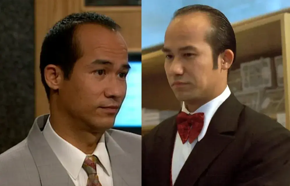 其实李子雄已经尽量让自己显年轻了,比如戴上了假发。熟悉李子雄的应该知道,他很早就有秃头迹象了,发际线非常高,当时颜值都不如现在高,更有反派气质。