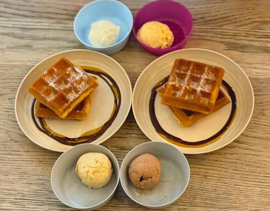 If dinner has left you and your friends feeling stuffed, order one serving of waffles and divide the squares among yourselves. What a feast of waffle ice cream!