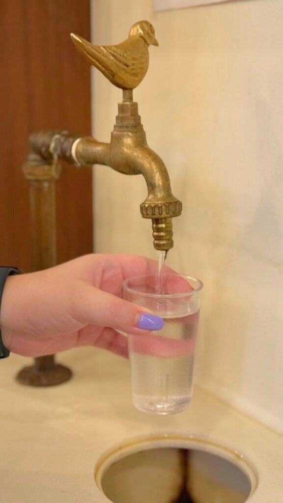 Water is complimentary for all dine-in customers, aesthetically presented by a bronze-coloured tap with plastic cups by the side for anyone to have a quick sip.