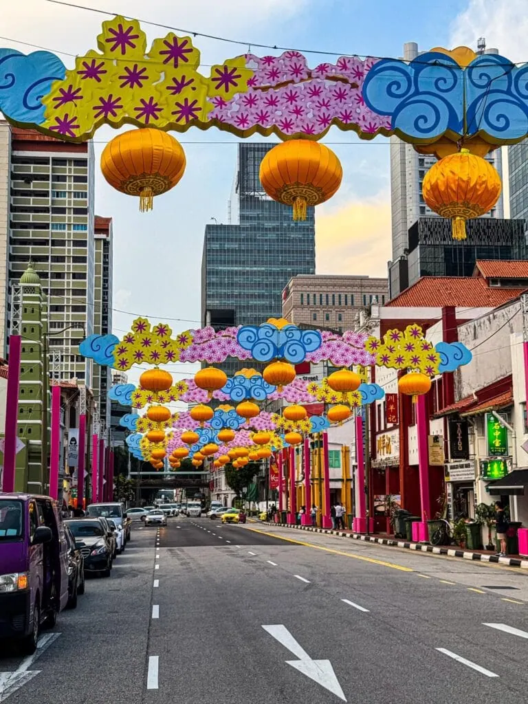 Stroll along New Bridge Road and Eu Tong Sen Street to walk beneath a vibrant overhang, featuring lotus flowers, fans with rabbits, jade pendants, and a full moon. Each symbol was meticulously chosen to reflect harmony, beauty, and reunion.