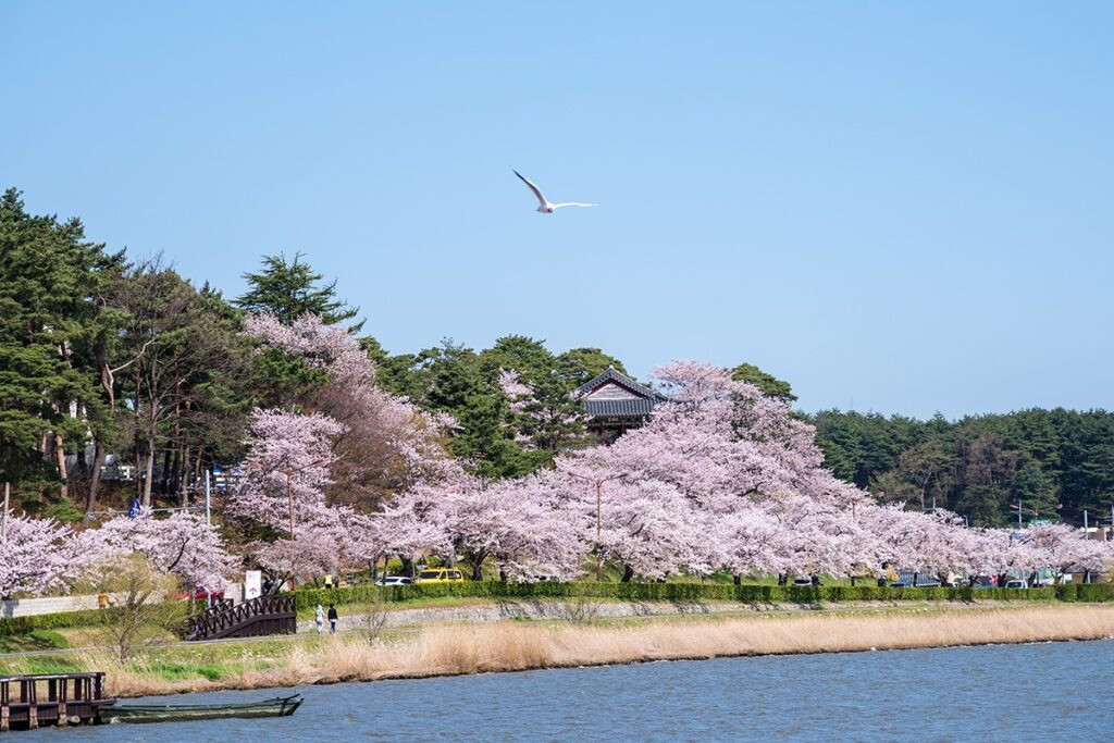 Gyeongpoho Lake is one of Gangneung’s most iconic destinations, especially when cherry blossoms are in full bloom. During the spring, the Gyeongpo Cherry Blossom Festival brings a season of fun and community under the dancing trees.
