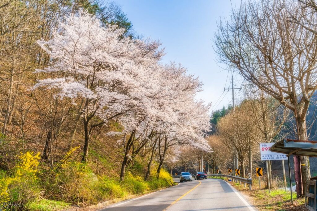 Offering a dense shade of cherry trees and picturesque lake views, Daecheongho Cherry Blossom Road spans from Dong-gu (Daejeon) towards Hoenam-myeon (Boeun-gun, Chungcheongbuk-do), wrapping around Daecheongho Lake.